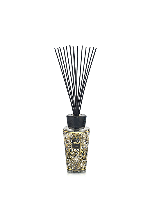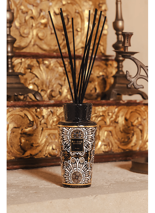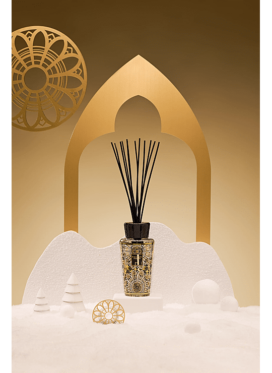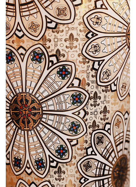 De Rosace-diffuser is geïnspireerd op de gotische architectuur en de majestueuze glas-in-loodramen van kathedralen. Het glas is bedrukt met een zeefdruk in 24-karaats goud, die de geometrische motieven van middeleeuwse rozetten weergeeft, subtiel getekend op een achtergrond van lelies, symbool van adel en zuiverheid. Dit verfijnde decoratieve object verspreidt een elegante geur en houdt de betoverende sfeer van de Rosace-collectie het hele seizoen lang in huis.