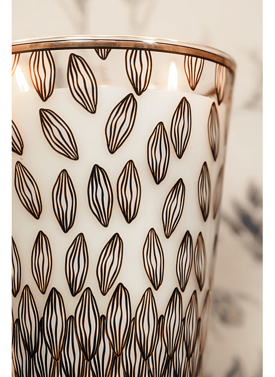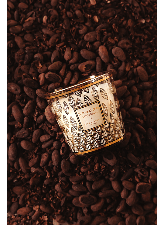 De geurkaars Pérou is een eerbetoon aan de criollo-bonen die exclusief in Peru worden geoogst en herkenbaar zijn aan hun unieke witheid, waardoor de donkere chocolade uit Peru eruitziet als melkchocolade. Een regen van witte en gouden bonenpatronen dwarrelt neer op het glas en zorgt voor een zeer decoratief en kostbaar effect. Het wit van dit motief doet denken aan de structuur van de bonen zelf. De geur is niet alleen een ambassadeur van de Peruaanse smaken, maar ook de bewaker van een ecosysteem waar jasmijn en cacaobomen in harmonie naast elkaar groeien.