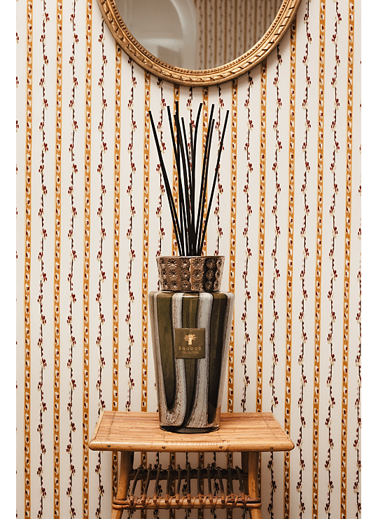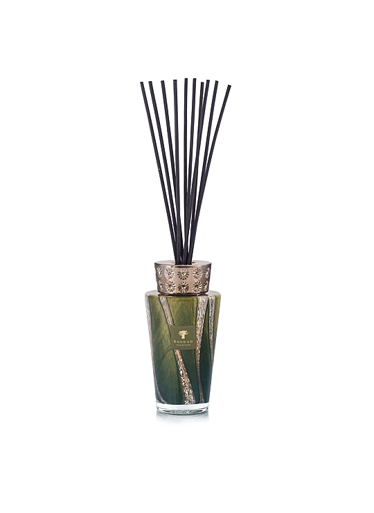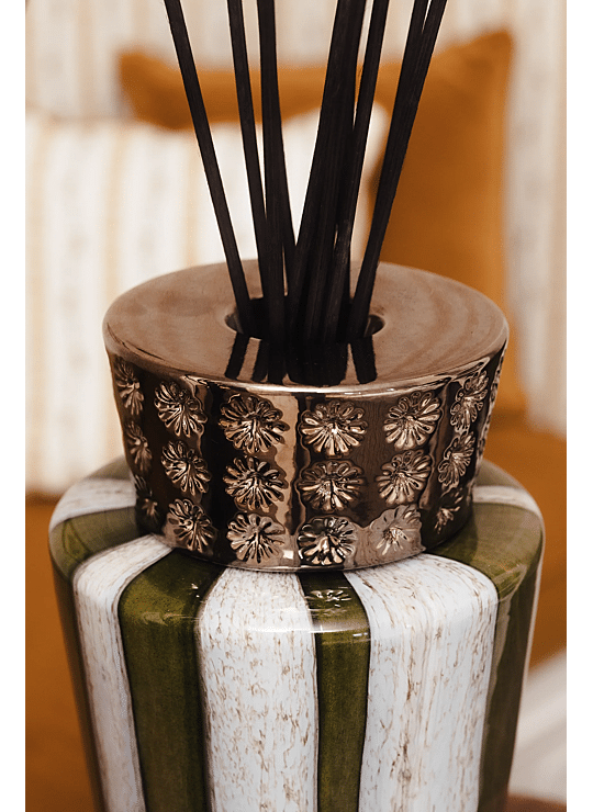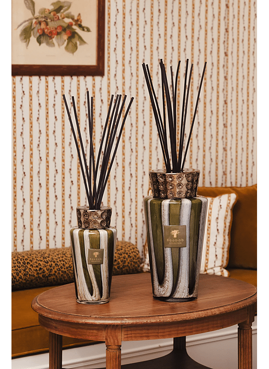 De Sherwood-parfumdiffusers zijn versierd met verticale lijnen die lijken op majestueuze boomstammen die naar de hemel reiken. Het glas van de flacons, in verschillende tinten groen, past in elk interieur als een uniek en majestueus decoratieobject. Het houtachtige parfum van de Totem Sherwood-parfumdiffusers past perfect in een verfijnde en elegante omgeving.