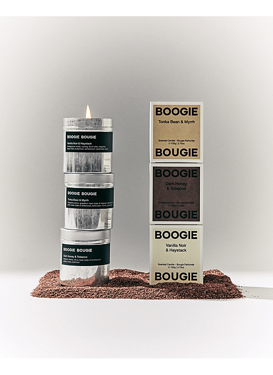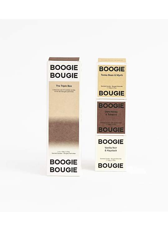 The Triple Box is an olfactory journey through a selection of some of our finest fragrances. Whatever trips your trigger, keep the ambiance in check with the sweet and woody 'Dark Honey & Tobacco', 'Tonka Bean & Myrrh', and the vigorous 'Vanilla Noir & Haystack'. Gourmandise vibes quoi.