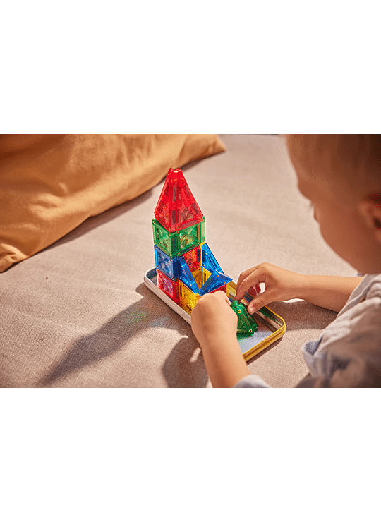 De 28 mini magnetische tegels worden geleverd in een metalen blikje, zodat al je minibouwwerken rechtop en intact blijven, zelfs onderweg.