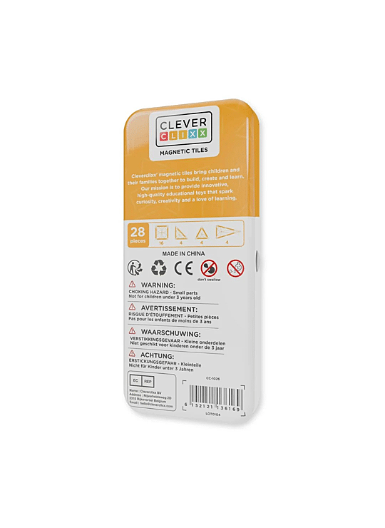 Grote creativiteit in een klein pakket! De Cleverclixx Mini Tiles Pack – 28 stuks is perfect voor jonge bouwers en kleine handjes. Deze compacte magnetische tegels zijn gemakkelijk mee te nemen – ideaal voor vakanties, autoritten, familiebezoeken of restaurantuitjes. Waar je ook bent, Cleverclixx brengt creatief plezier binnen handbereik.