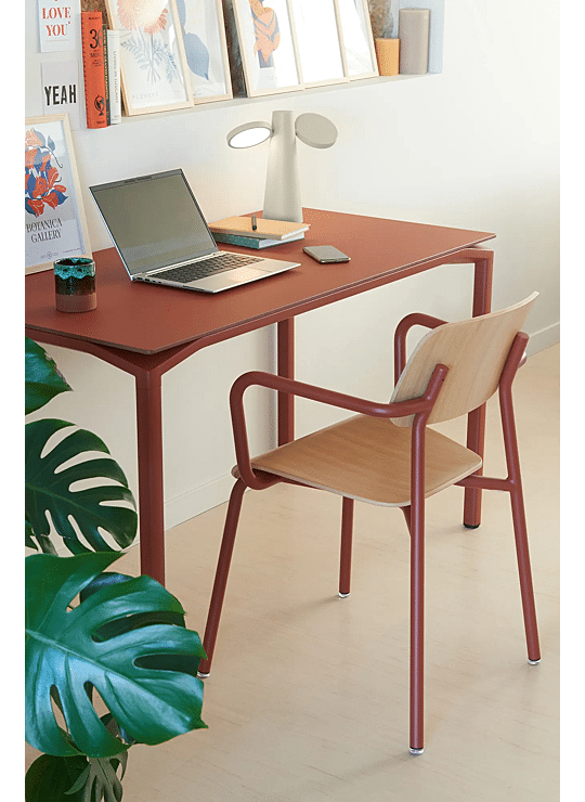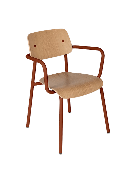 Met zijn esthetische eenvoud, ergonomische silhouet en speelse details zal de Studie-bridge in eikenhout uw woonkamer, eetkamer of slaapkamer onmiddellijk opfleuren. Deze binnenshuisfauteuil, die de creativiteit van ontwerper Tristan Lohner combineert met het vakmanschap van Fermob in het bewerken van verschillende materialen, is een echte knipoog naar de kindertijd en onbezorgdheid. Geïnspireerd door de iconische schoolstoel, hebben we onze vaardigheden gebundeld om dit ontwerp te realiseren, maar ook onze passies, dromen en vrolijke momenten. Dit meubelstuk, dat eruitziet als een levensgrote smiley, bestaat uit een rugleuning met lachende ogen en een gewelfde zitting, beide van eikenhout. Dit natuurlijke en recyclebare materiaal is niet alleen edel en warm, maar contrasteert ook perfect met het stevige aluminium van de structuur. De armleuningen van deze bridge zorgen ervoor dat u comfortabel zit, terwijl de gepatenteerde Fermob-glijders ervoor zorgen dat hij geruisloos kan worden verplaatst. Gezien zijn universele karakter en eenvoudige lijnen past deze binnenstoel, die verkrijgbaar is in verschillende kleuren (zie kleurenkaart), zowel bij verschillende tafels uit onze collecties als bij tal van interieurstijlen. Ver weg van het klaslokaal zal de Studie-bridge uw interieur veroveren!