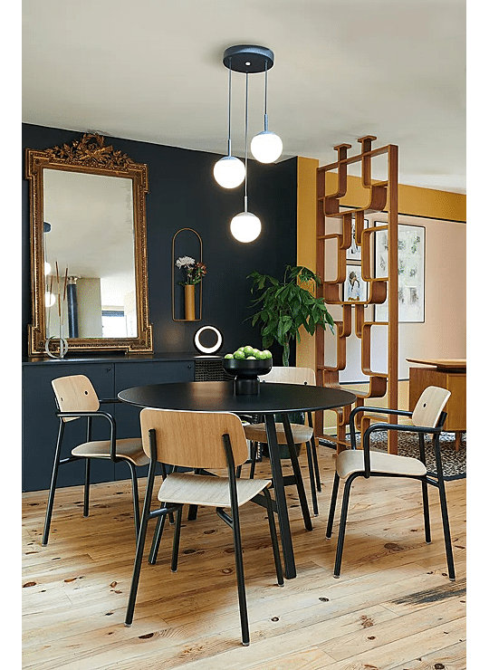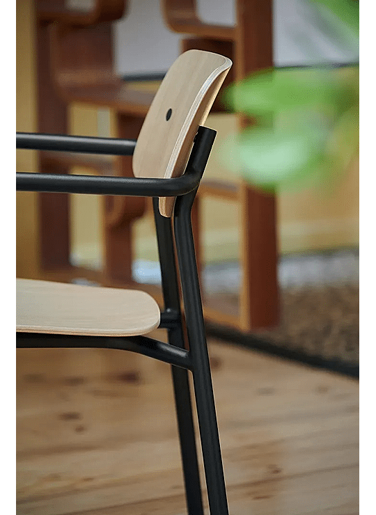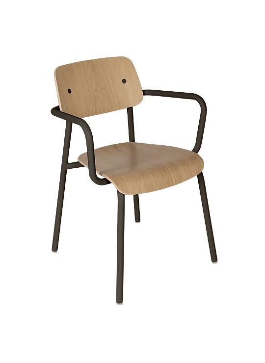 Met zijn esthetische eenvoud, ergonomische silhouet en speelse details zal de Studie-bridge in eikenhout uw woonkamer, eetkamer of slaapkamer onmiddellijk opfleuren. Deze binnenshuisfauteuil, die de creativiteit van ontwerper Tristan Lohner combineert met het vakmanschap van Fermob in het bewerken van verschillende materialen, is een echte knipoog naar de kindertijd en onbezorgdheid. Geïnspireerd door de iconische schoolstoel, hebben we onze vaardigheden gebundeld om dit ontwerp te realiseren, maar ook onze passies, dromen en vrolijke momenten. Dit meubelstuk, dat eruitziet als een levensgrote smiley, bestaat uit een rugleuning met lachende ogen en een gewelfde zitting, beide van eikenhout. Dit natuurlijke en recyclebare materiaal is niet alleen edel en warm, maar contrasteert ook perfect met het stevige aluminium van de structuur. De armleuningen van deze bridge zorgen ervoor dat u comfortabel zit, terwijl de gepatenteerde Fermob-glijders ervoor zorgen dat hij geruisloos kan worden verplaatst. Gezien zijn universele karakter en eenvoudige lijnen past deze binnenstoel, die verkrijgbaar is in verschillende kleuren (zie kleurenkaart), zowel bij verschillende tafels uit onze collecties als bij tal van interieurstijlen. Ver weg van het klaslokaal zal de Studie-bridge uw interieur veroveren!
