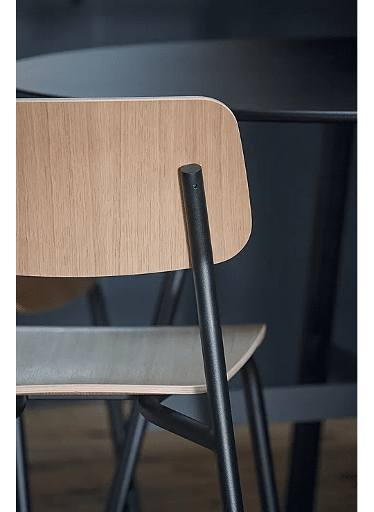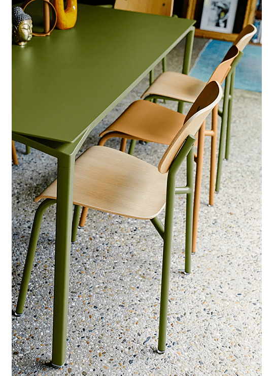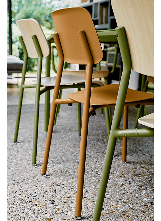 Met zijn levensgrote smiley-look brengt de Studie-stoel in eikenhout een glimlach op ons gezicht! Deze vernieuwde schoolstoel is het resultaat van de creativiteit van ontwerper Tristan Lohner en het vakmanschap van Fermob op het gebied van verschillende materialen, en is een knipoog naar de kindertijd en onbezorgdheid. Bij het ontwerpen van deze binnenstoel hebben we niet alleen onze vaardigheden gebundeld, maar ook onze passies, dromen en vrolijke momenten. Dit meubelstuk bestaat uit een gewelfde zitting, die optimaal comfort belooft, en een rugleuning met twee kleine nopjes, het originele kenmerk van dit ontwerp. Eikenhout is niet alleen natuurlijk en recyclebaar, maar ook een edel en warm materiaal dat perfect contrasteert met het stevige aluminium. De metalen structuur geeft deze binnenstoel een moderne uitstraling en stabiliteit. Dankzij de geluidsdempende glijders kan hij geruisloos worden verplaatst, terwijl zijn eenvoudige lijnen hem een zeer gewaardeerde tijdloosheid geven. Deze stoel is verkrijgbaar in verschillende kleuren (zie kleurenkaart) en past harmonieus bij een breed scala aan tafels uit onze collecties. Ver weg van het klaslokaal staat de Studie-stoel in eikenhout op het punt een nieuw leven te beginnen in uw eetkamer, woonkamer of slaapkamer.