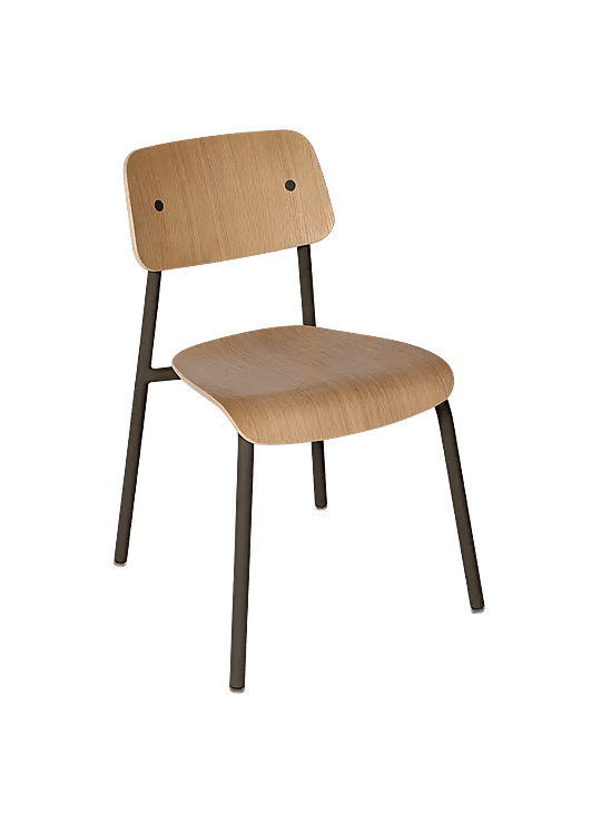 Met zijn levensgrote smiley-look brengt de Studie-stoel in eikenhout een glimlach op ons gezicht! Deze vernieuwde schoolstoel is het resultaat van de creativiteit van ontwerper Tristan Lohner en het vakmanschap van Fermob op het gebied van verschillende materialen, en is een knipoog naar de kindertijd en onbezorgdheid. Bij het ontwerpen van deze binnenstoel hebben we niet alleen onze vaardigheden gebundeld, maar ook onze passies, dromen en vrolijke momenten. Dit meubelstuk bestaat uit een gewelfde zitting, die optimaal comfort belooft, en een rugleuning met twee kleine nopjes, het originele kenmerk van dit ontwerp. Eikenhout is niet alleen natuurlijk en recyclebaar, maar ook een edel en warm materiaal dat perfect contrasteert met het stevige aluminium. De metalen structuur geeft deze binnenstoel een moderne uitstraling en stabiliteit. Dankzij de geluidsdempende glijders kan hij geruisloos worden verplaatst, terwijl zijn eenvoudige lijnen hem een zeer gewaardeerde tijdloosheid geven. Deze stoel is verkrijgbaar in verschillende kleuren (zie kleurenkaart) en past harmonieus bij een breed scala aan tafels uit onze collecties. Ver weg van het klaslokaal staat de Studie-stoel in eikenhout op het punt een nieuw leven te beginnen in uw eetkamer, woonkamer of slaapkamer.