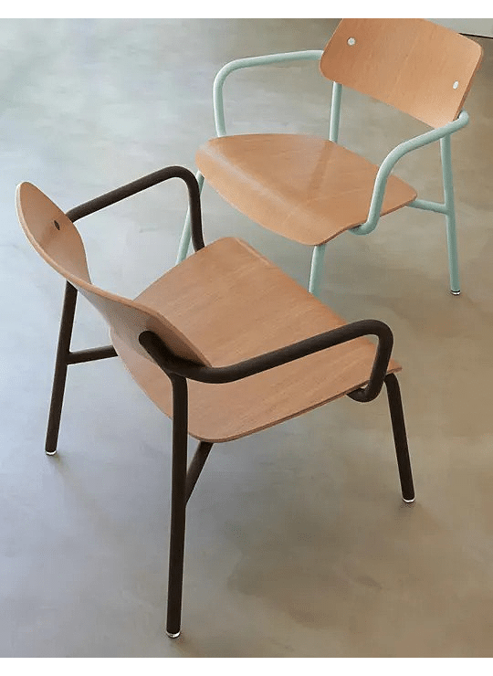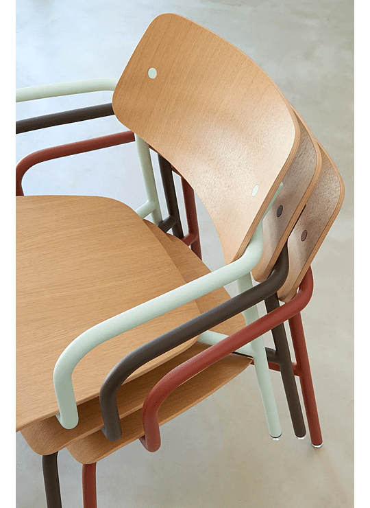 Deze stoel is de perfecte combinatie van de stevigheid van aluminium en de warmte van eikenhout, waardoor een harmonieus meubelstuk ontstaat voor uw momenten van ontspanning. Stelt u zich eens voor: een royale, comfortabele zitting, zachte en omhullende lijnen, een verfijnde afwerking en dat kleine extraatje dat het verschil maakt. Omdat we graag schoonheid en functionaliteit combineren, is deze stoel even ergonomisch als duurzaam. Hij is stapelbaar en praktisch en voorzien van ‘stille glijders’ voor een zachte, geluidsloze ervaring, zowel fysiek als akoestisch.