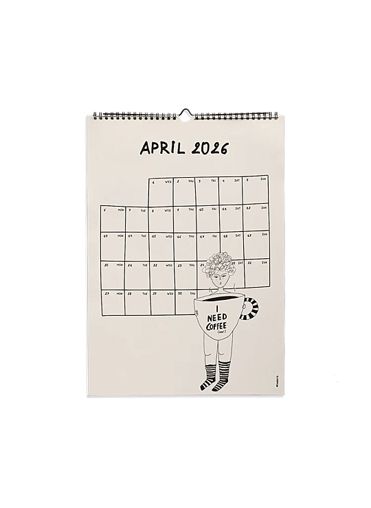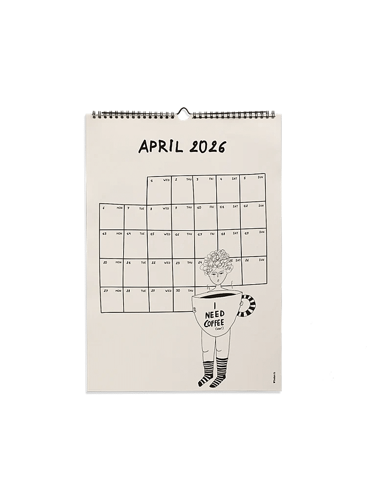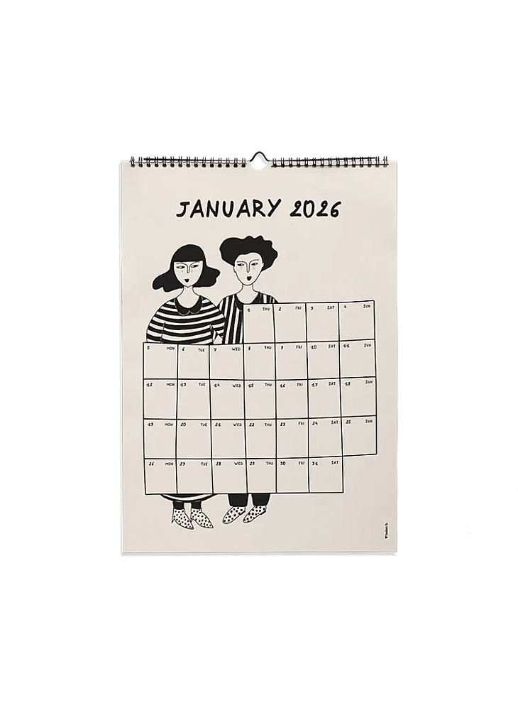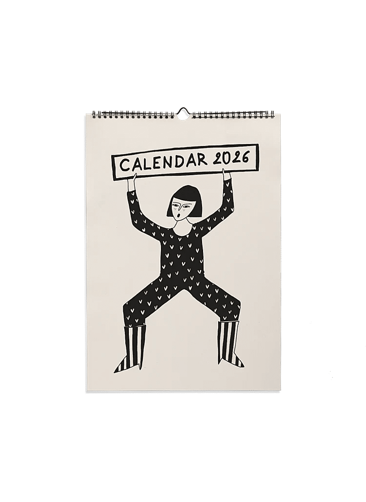 Kalender 2026 met voor elke maand een andere helen b-tekening, gedrukt op biotop-papier