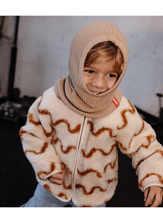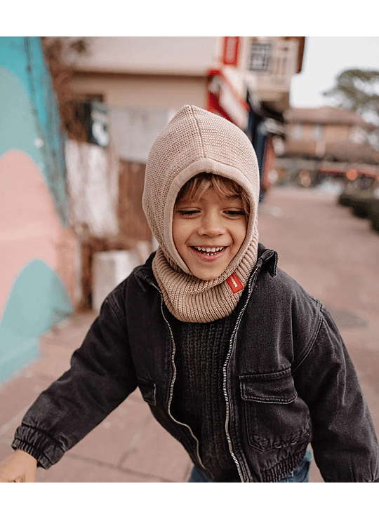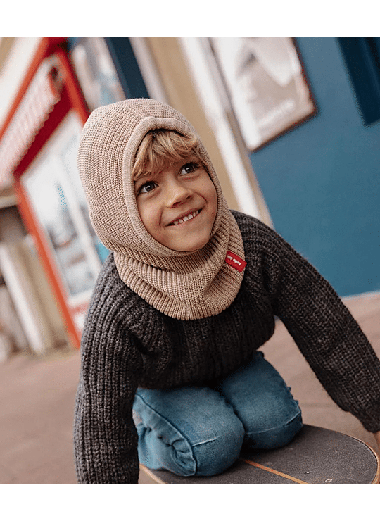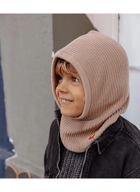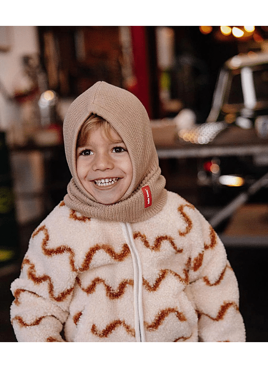Val voor de Balaclava kind en baby, Hoody Latte, vanaf 9 maanden. Heel zacht, volledige bedekking, perfect tegen de kou. Effen rib tricot, gemaakt van Oeko-Tex bio katoen. Ook cool als snood. Een musthave voor je wintergarderobe.