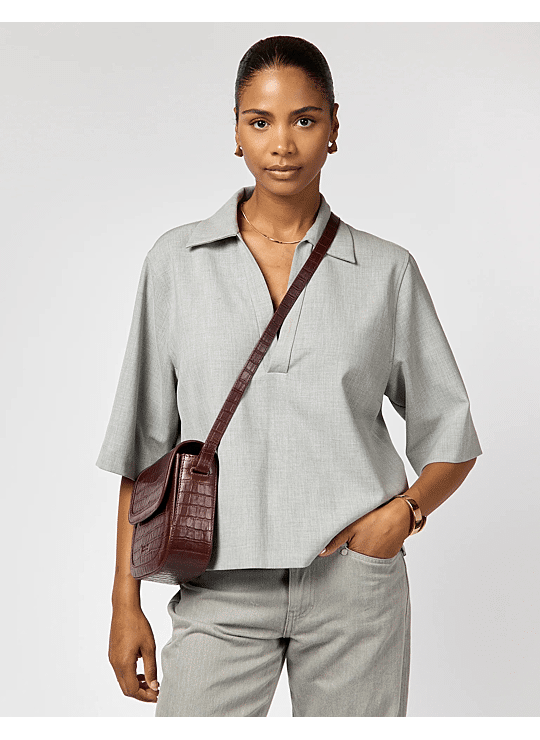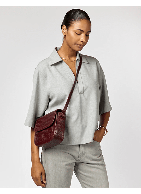 In Kersenrood Croco is Nina een krachtige mix van kleur en textuur. De croco-embossed afwerking en de sculpturale details van de overslag maken haar tot een echte blikvanger. De binnenkant biedt drie georganiseerde vakken en de verstelbare strap zorgt voor draagcomfort – van werkdag tot weekend. Voor wie houdt van strak design met een vleugje edge.