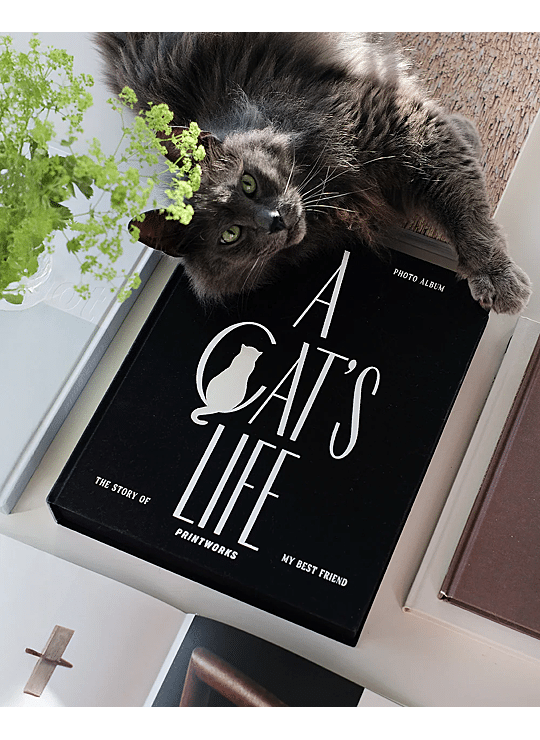 Ontdek ons fotoalbum gewijd aan het gekoesterde leven van je harige metgezel. "A Cat's Life" heeft een prachtige zwarte stoffen kaft met witte tekst. Binnenin vind je 30 pagina's hoogwaardig fotopapier, waarmee je gemakkelijk je foto's kunt bevestigen met behulp van onze stickers of fotocorners, die apart worden gekocht.